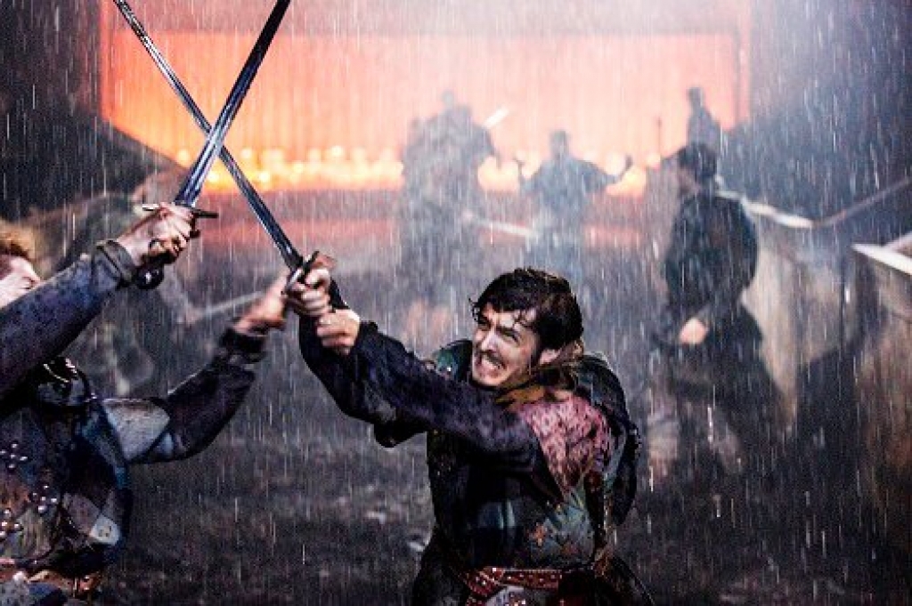 Mūs sagaida krēslaina baznīcas telpa ar tukšu, bet joprojām iezīmētu altāra daļu, kur smaržo puslokā iedegtas sveces; tās turpina iededzināt sieviete garā tērpā un baltā galvassegā, – vēlāk izrādās, ka tā bijusi lēdija Makbete. Kad askētiskajā, garenajā telpā uz koka soliem sasēdināti visi jauniesvaidītie klanu locekļi, atskan brīnišķs, vīru balsu izpildīts korālis. Bet tas mūsu satraukto uztveri neglāsta ilgi: pēkšņi spēles telpu starp abās pusēs novietotajiem skatītāju soliem piepilda bungu rīboņa un kaujas troksnis. Telpā iebrūk un kā no zemes izaug (spēles laukumu klāj īstas zemes kārta) pārdesmit karavīri vienkāršos, pelēkbrūnrūtotos kaujas tērpos ar skotu apmetņiem un svārkiem virs biksēm un smagiem zābakiem. Viņi kaujas nikni un ar īstiem zobeniem, un starp dedzīgajiem cīnītājiem sākumā pat grūti atšķirt Keneta Branas rudmataino drošsirdi Makbetu, kurš cīkstas kā īsts lauva. Kaujas sākumā tiek iedarbināts viens no nedaudzajiem izrādes specefektiem: no griestu lūkas uz cīnītājiem sāk līt īsts lietus, kas zemi tūlīt pārvērš dubļu ķēpā. Cīņa turpinās vēl niknāk, vēl izmisīgāk, dubļi pa reizei apšļaksta nožogojuma sienas vai pat dažu pēdu attālumā sasēdušos skatītājus, – patiesi efektīgi, īsti un baisi. Tikpat spēji, kā sākusies, kauja beidzas, kritušie tiek aizvākti vai paliek guļam ar seju dubļos (brrr!).