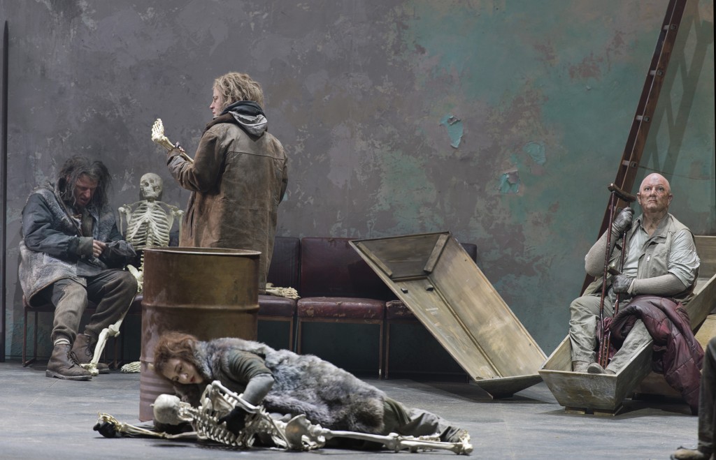 Režisora radītā postapokaliptiskā nākamības aina ir patiesi vizuāli iespaidīga un baisa. Atsvešinātība un nolemtība pulsē arī muzikālajā partitūrā (diriģents Ingo Mecmahers), jo pēc komponista vēlēšanās libretists Deivids Harsents (Harsent) akcentējis senās angļu leģendas rituālos aspektus: Zaļais bruņinieks paziņo par savu ierašanos pie Artura, klauvējot trīs reizes, Gaveins Zaļā bruņinieka pilī nakšņo trīs naktis (gluži kā daudzās mums pazīstamās pasakās), ar kaujas cirvi tiek cirsts trīs reizes utt. Taču, ja libretā vēl jaušama drūmas, tomēr poēzijas un lirikas klātbūtne, kas atbalsojas arī mūzikā, uzveduma pirmajā daļā režisors to ir ravējis ārā ar visām saknēm, uzsverot vispārējo nolemtības, bezcerības noskaņu un degradācijas ainu, kurā kā vārgi cilvēcības signāli – pīkstieni atskan cilvēcisku seju saglabājušā Āksta taujājumi par to, kur gan palikuši pagājības varoņi un viņu dižie darbi. „Nav nekā tāda vairs, i neceriet, i nesapņojiet!” – it kā atbild Hermanis. Jo cilvēki vairs neieklausās arī dabas balsīs, kas, režisoraprāt, ir viedas un klātesošas – un tās pārstāv gan Zaļais bruņinieks, viņš arī Bertilaks de Hautdeserts (dziedāja Džons Tomlinsons), gan Morgana le Fleja (Laura Eikina) un lēdija de Hautdeserta (Dženifera Džonstone).